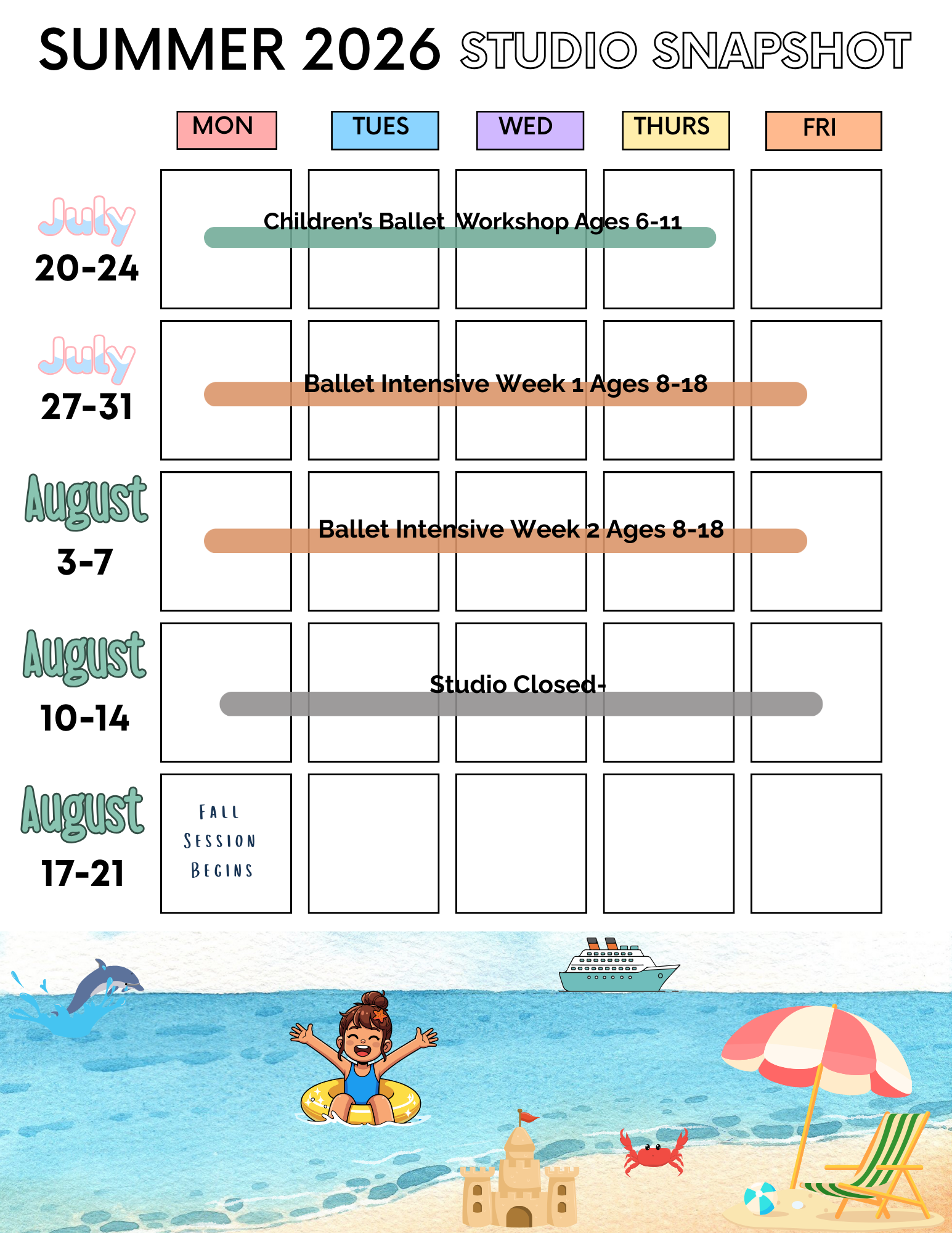 Discover our exciting summer camps & workshops for dancers of all ages! Our studio offers a wide range of dance and creative summer workshops, all in a safe and supportive environment. Make this summer unforgettable with new friends, new skills, and unforgettable memories! Check out our summer overview below and them click on the Camp Book link for more details about each camp!
