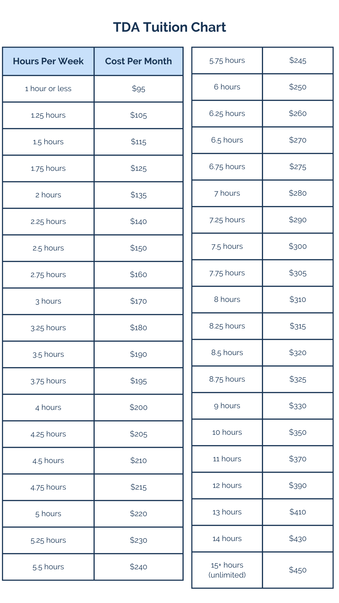 Use the TDA tuition chart to determine your monthly fee (ex. 1 jazz 2 class (1 hour) and 1 Intermediate Hip Hop class (1 hour) would be a total of 2 hours of class per week, so monthly tuition for your student would be $135.00)