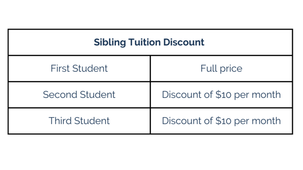 • Tuition is due on the 1st of each month. A late fee of $20 will be applied on the 6th for unpaid balances.